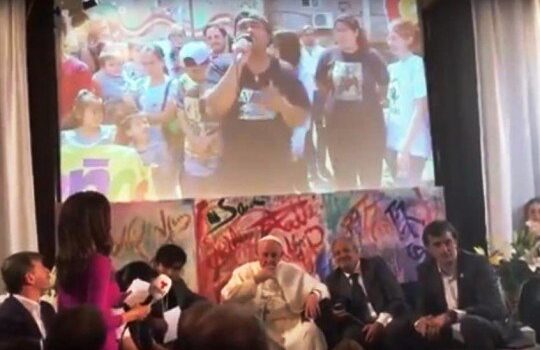 Jóvenes de la villa de Retiro cantaron un rap que escuchó Francisco por videoconferencia. Fue en la inauguración de una sede de Scholas.